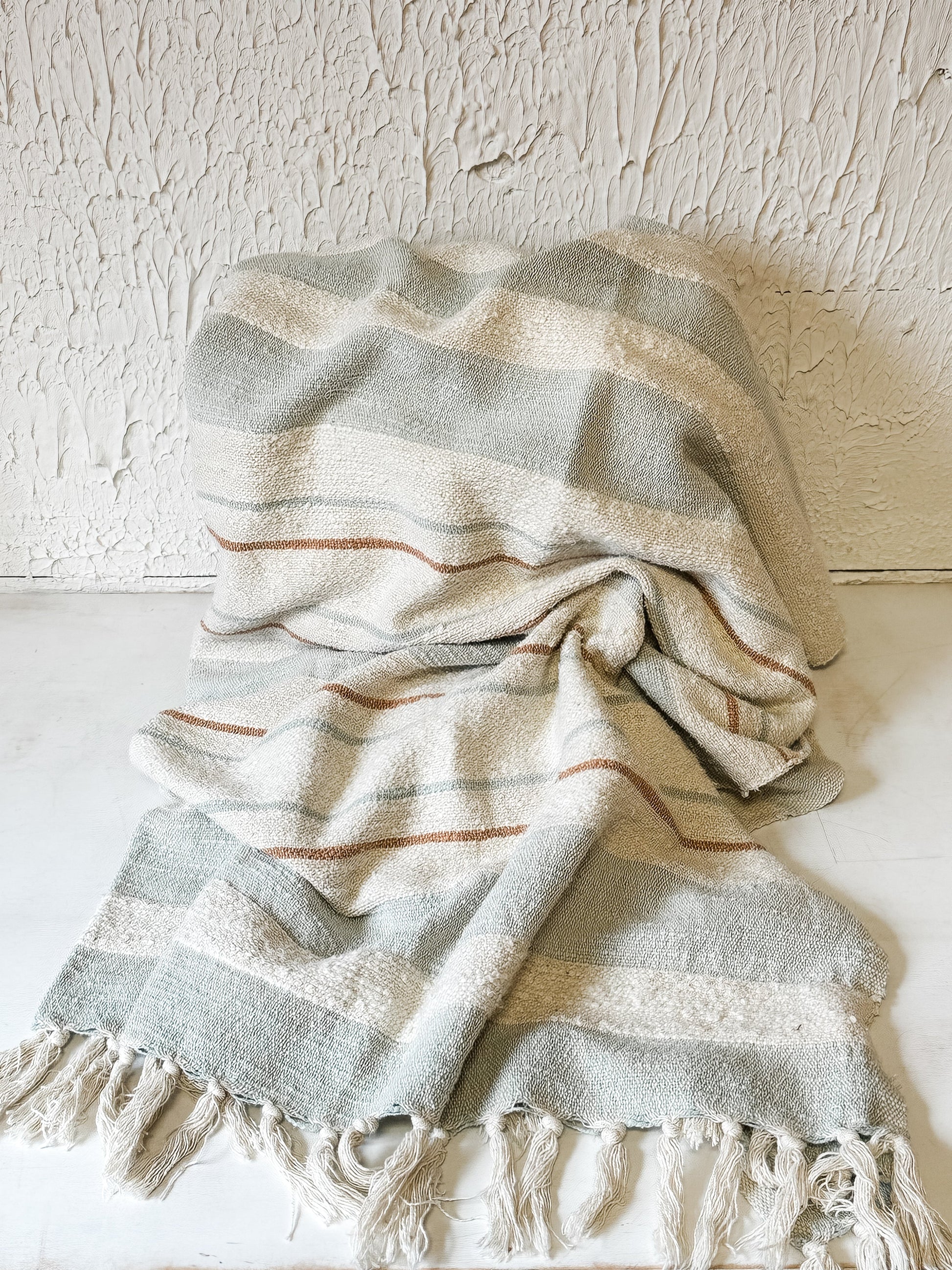 Add some comfort and style to the living space with this woven cotton throw. This cotton throw features a soft, cozy feel with cream, blue, and grey vertical stripes and fringe on both ends. It's perfect for curling up on the couch, snuggling in bed, or relaxing on a chair, and can be paired with various styles like farmhouse, coastal, transitional, lodge, and cabin. Measuring 60 inches in length and 50 inches in width, it's a generous size for covering up. Enjoy the beauty and functionality of this woven cotton throw, making the home or any space more inviting and cozy.